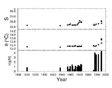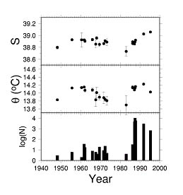 Figure 1. Average salinity, potential temperature, and log number of observations in the depth interval of 1000-2000m in the Cretan Sea and of 2000-4000m in the western Levantine Sea areas. The error bars denote standard deviation. The averages are obtained from individual data sets contained within the combined MODB / POEM data and grouped into 1 year intervals falling within the specified depth range (Özsoy and Latif, 1996).