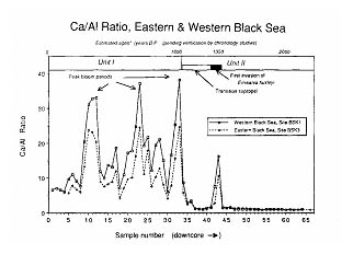 Figure 2. Ca/Al ratio of core samples from the eastern and western Black Sea, representing the ratio between biologically produced / terrigenous deposition of particles, as a function of core depth and time in years(top scale), (after Hay and Honjo, 1989).
