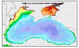 Fig. 1: Spring-summer mean chlorophyll-a concentration (2000) for the Black Sea derived from SeaWiFS satellite data (low chl-a concentration – blue, high chl-a concentration- red).