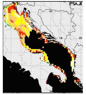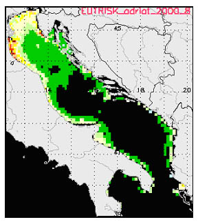 Two spatial eutrophication indices of shallow marine ecosystems have been developed, based on 3D hydrodynamic modelling data and satellite remote sensing data of ocean colour (Druon et al 2002). The Physically Sensitive Area index (PSA) integrates the various supporting factors of eutrophication, i.e., the physical conditions that influence the primary production in the upper layer and the oxygen availability near the sea bottom. The PSA index portrays the location of potential oxygen deficiencies if both the nutrient distribution and the primary production are uniformly distributed. The EUTrophication RISK index (EUTRISK) represents the spatial distribution of potential hypoxia for a given month integrating the physical supporting factors and the flux of organic matter estimated from satellite-derived chlorophyll-a maps, with an oxygen budget estimated on a monthly basis. The PSA and EUTRISK indices identify three main types of eutrophied waters: 1) eutrophic and sensitive, 2) eutrophic and resistant and 3) mesotrophic and sensitive. Category 1 is where the oxygen depletion occurs regularly because both the main pressure and supporting factors are unfavourable (e.g. coastal waters south of the Pô river mouth). Category 2 depicts areas where there is no severe hypoxia near the sea bed because of a permanent tidally-induced vertical mixing, but where the loss of biodiversity and the appearance of opportunist species are generally observed (e.g. Bay of Seine and Wash Embayment). In category 3, severe hypoxia or anoxia are reported due to particularly adverse physical conditions even if the primary production is relatively low (e.g. Kattegat and north of 450N in the Adriatic Sea). An example of PSA and EUTRISK is shown in Fig. 2 for the Adriatic Sea.